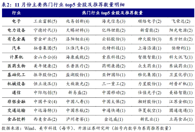 开源证券研报统计结果也显示,11月券商金股权重最靠前的行业为电子,且占比高达15.1%;电力设备紧随其后,占比为10.8%;有色金属、汽车位居其次,占比分别为7.8%、6.2%。