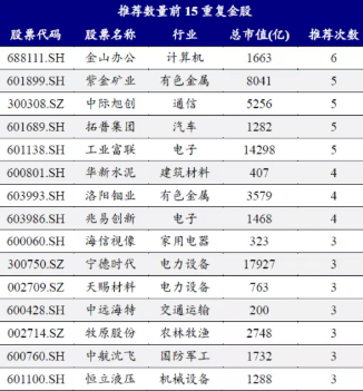 紫金矿业(601899)、中际旭创(300308)、拓普集团(601689)、工业富联(601138)等紧随其后,均被推荐了5次。华新水泥(600801)、洛阳钼业(603993)、兆易创新(603986)等,均被推荐了4次。