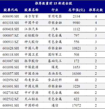 而在11月新进金股(相对2025年10月新进金股名单)中,海尔智家(600690)和中国平安(601318)被推荐次数最多,合计均被推荐了4次。